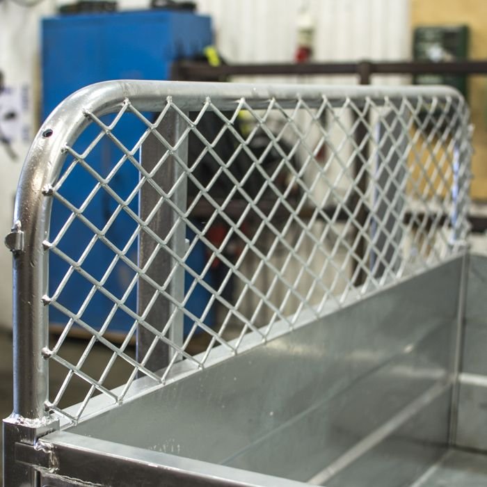 Conception Blindée : Plateforme revêtue de tôle d’acier et paroi avant fixe avec grille de protection.